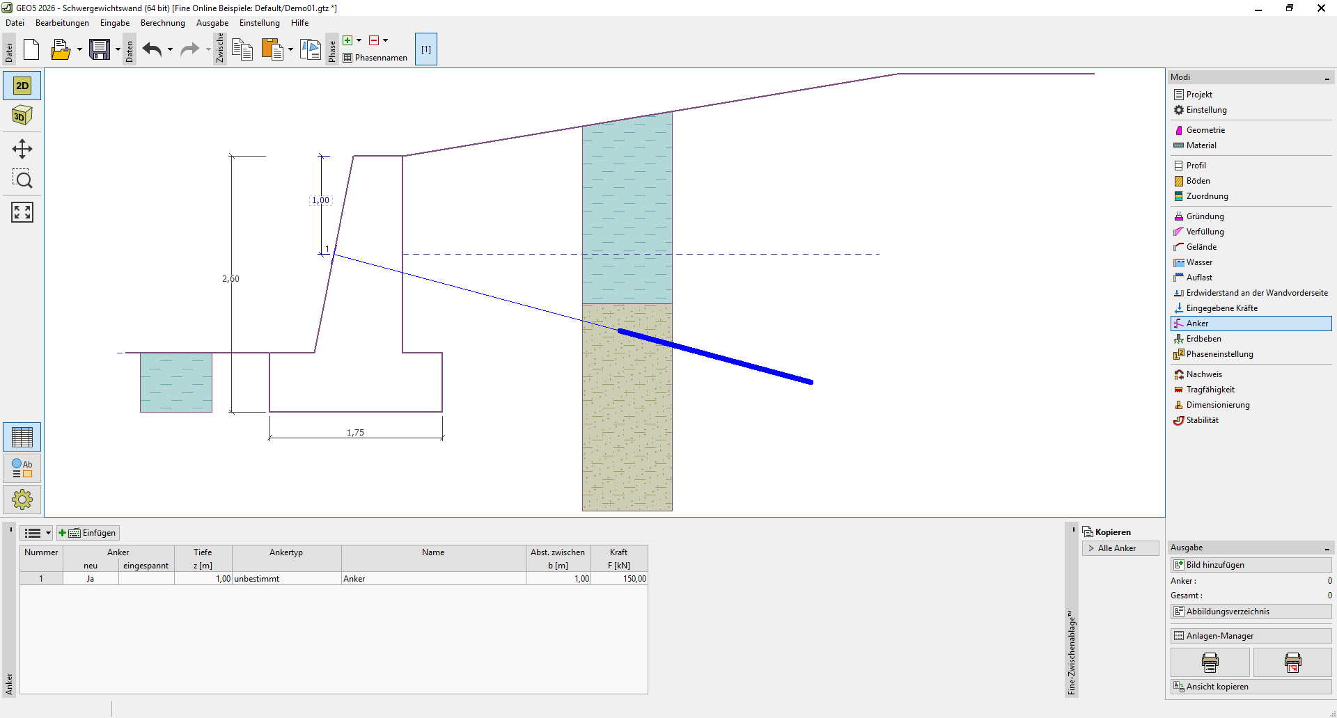 Anker können als vorgespannt (nicht definiert, vorgespannte Stabanker, Litzenanker) und nicht vorgespannt (Schraubanker-Helix, nicht vorgespannte Stabanker, Ankerzugstangen) eingegeben werden.